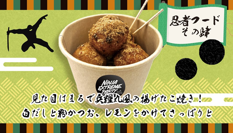 伊賀・甲賀・うずまさ忍者の特徴をとらえたメニューやあそびながら楽しめるテイクアウトフードも♪