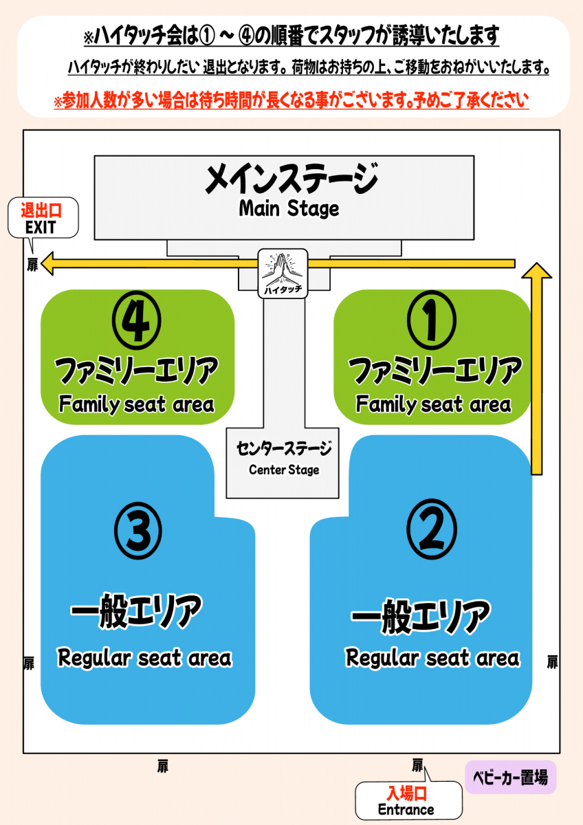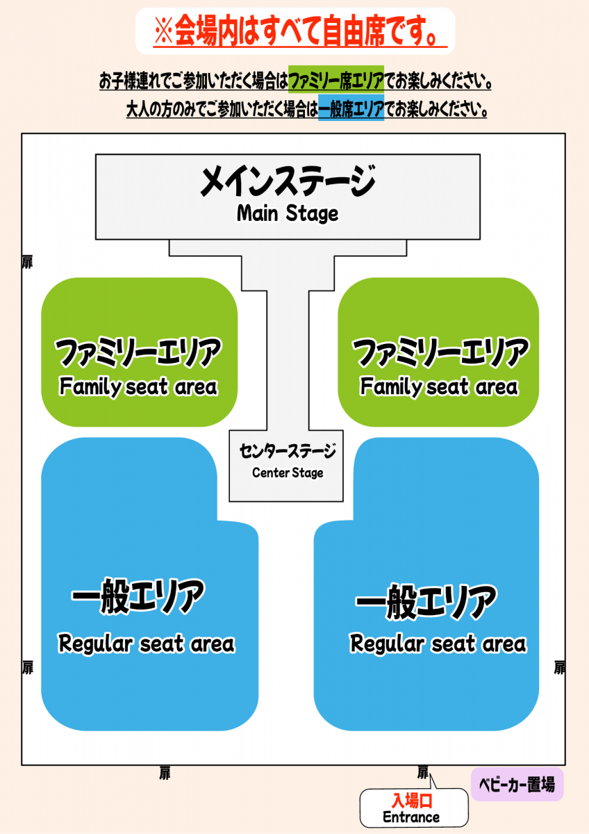※イベント中、ご自身の座席の幅を超える動きをされている方にはお声かけをさせていただく場合がございます。お子様の多いイベントですのでご配慮のほどよろしくお願いいたします。