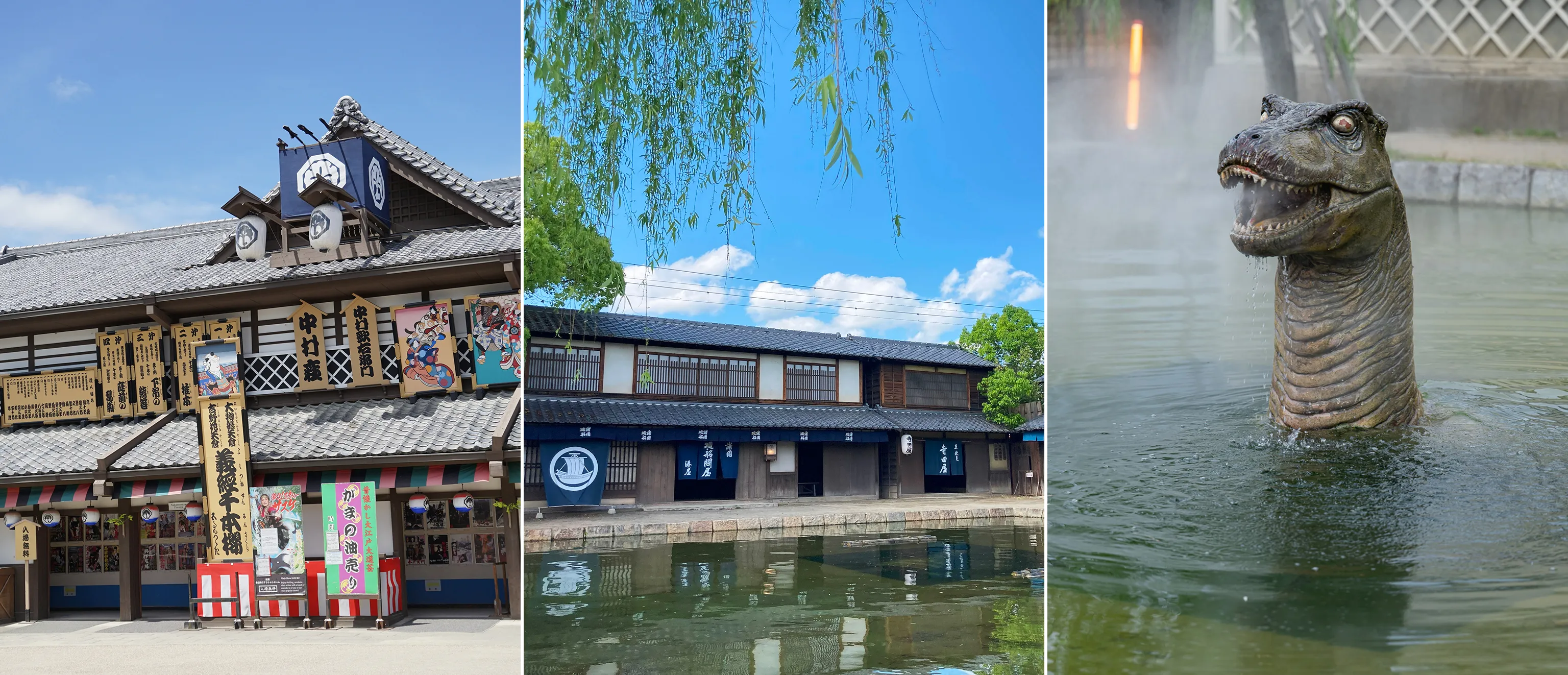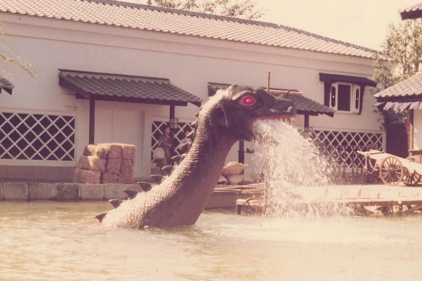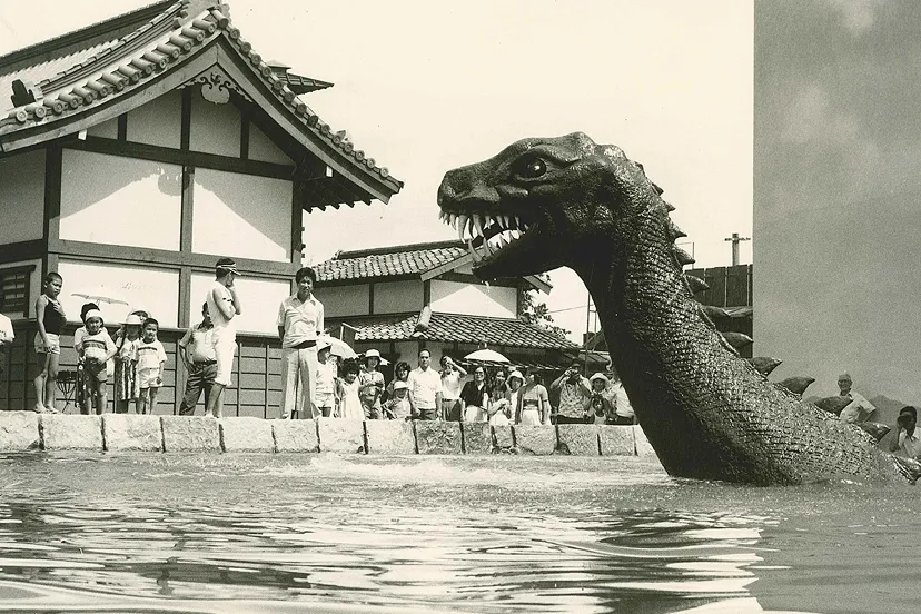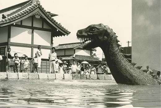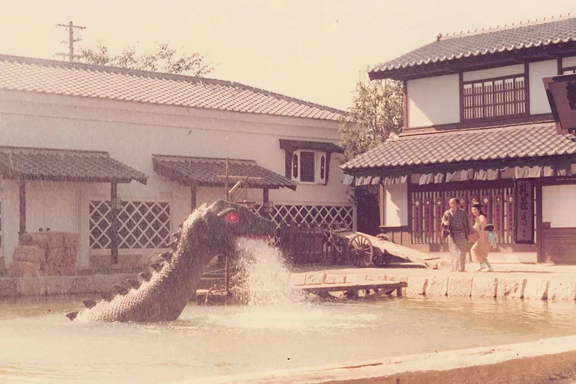 港町のプールに5分おきに登場する恐竜。1978年に1代目恐竜が誕生し、現在の恐竜は2代目。子どもからも大人からも映画村の人気者。怪獣の特撮シリーズが流行っていた1978年に子どもたちに喜んでもらおうと誕生しました。撮影があるときは顔を出さずプールの中で静かにしています。